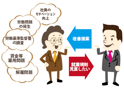 私たちは、入念なヒアリングを行い、企業があるべき方向へ進むための労務管理体制の提案と、経営の意向を反映させた会社としての機能を十分に発揮できるような就業規則づくりをお手伝いいたします。